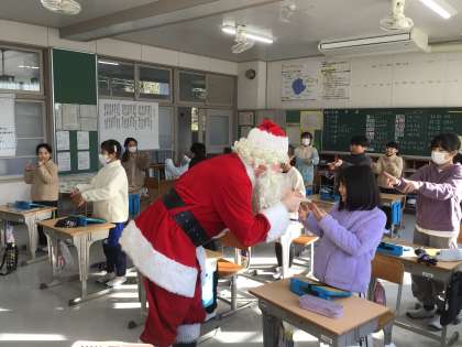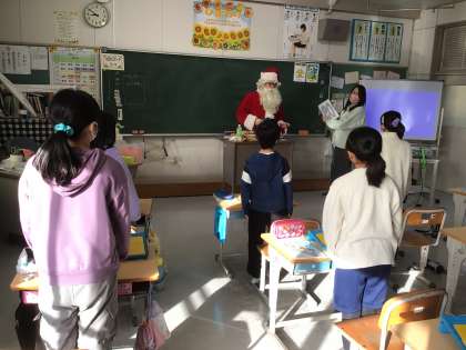 ALTのカイル先生がサンタクロースに仮装して、楽しい雰囲気の中、外国語の授業を行なっていました。アメリカのクリスマスの過ごし方をクイズ形式で各自のタブレットを使い学びました。