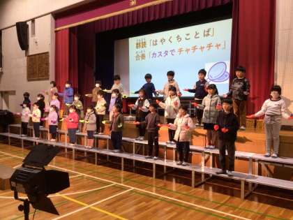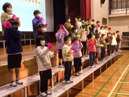 1・2年生が体育館の舞台でカスタネットの練習をしていました。曲に合わせてカスタネットを叩き、かわいい振り付けも取り入れていました。