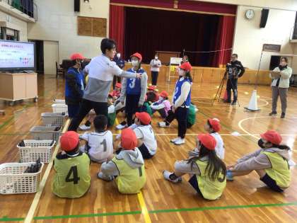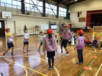 ネット型スポーツの実践を大学の先生に参観していただきました。皆が楽しめるようにルールを作り、攻撃がうまくいくように作戦を考えてゲームに取り組んでいます。児童の学びがより深まるように授業後に講師から指導していただきます。