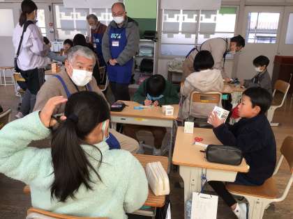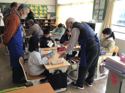 ものづくりサポートセンターの講座をお願いして「コトコト車」を作ります。児童の創造性や感受性を高める目標のもとに、複数のポーターの皆さんが児童に丁寧に支援してくださっています。