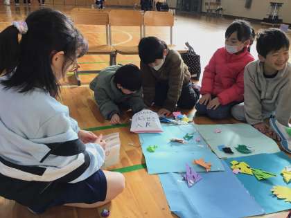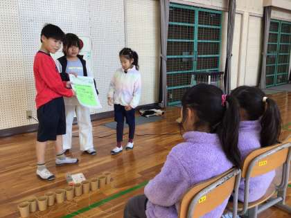 2年生が生活科で作ったたくさんのおもちゃを1年生に紹介しました。作り方と遊び方の説明をした後で、1年生におもちゃで遊んでもらいました。