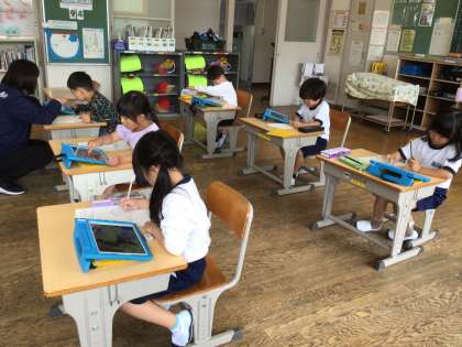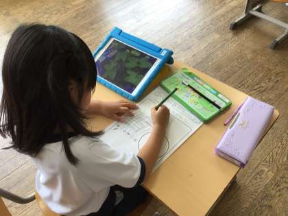1年生が、生活科で、アサガオの観察カードを書いていました。学習用タブレットを活用して記録したアサガオの写真を見て、葉っぱの様子を大きく描きました。どの子も集中して取り組んでいました。