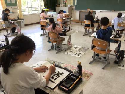 5 ・6年生が、書写の時間に、毛筆で字を書いていました。5年生は、「しんにょう」の形や部分の組み立て方に気をつけて「道」。6年生は、3つの部分の位置や大きさの関係を意識して「湖」。どの子も集中して書いていて、とても上手でした。