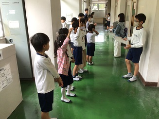 月・水・金曜日のろんろんタイムは わくわく班で掃除をします。1年生はお兄さんお姉さんのお手本を見て、やり方を覚えます。掃除の後は、みんなで振り返りをし、班長さんが、そうじがんばりカードを書いていました。