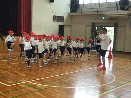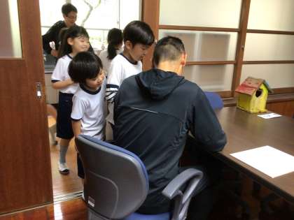3・4年生の走り方教室では、中京大学の青戸慎司さんから、走り方のコツを5つ教えていただきました。青戸さんは、1988年ソウル五輪、1992年バルセロナ五輪、1988年長野冬季五輪に出場したアスリートです。子どもたちは、サインももらって大喜びでした。
