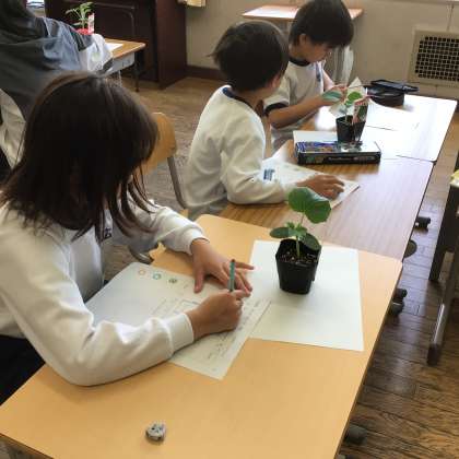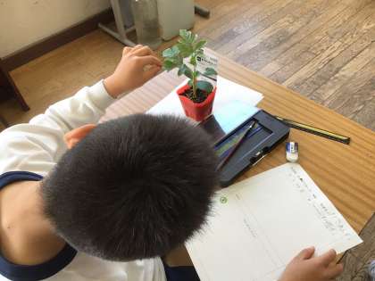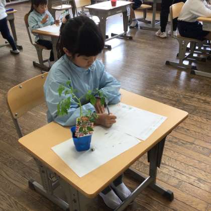 2年生が生活科で、野菜の苗の観察をしていました。目と手と鼻を使ってじっくり見て、たくさん発見していました。明日、畑に植えるのが楽しみですね。