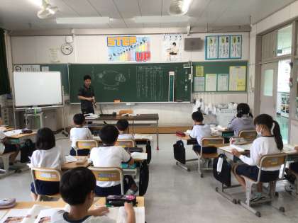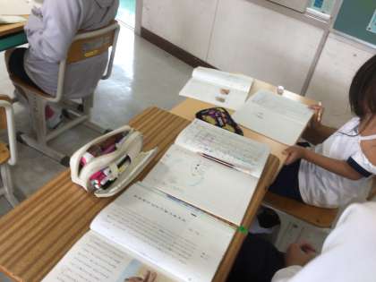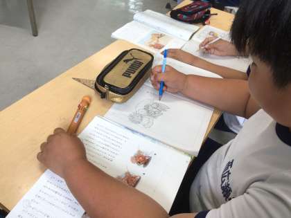 4年生が、国語科「ヤドカリとイソギンチャク」の学習で、説明文から読み取ったことをノートに上手にまとめていました。「ヤドカリの絵もかけた。どう?」「上手だね!」と、友だちの頑張りを認め合っているところも素敵です。
