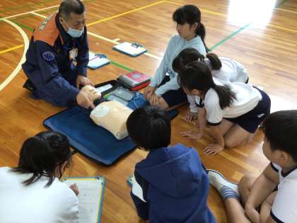 消防署職員の方をお招きして、5年生が応急手当講習を受けました。映像を見たり、模型を使って、心臓マッサージを実際に行ったりしました。AEDの使い方も教えていただき、小さい子どもの場合について質問するなど、真剣に学ぶ姿が見られました。