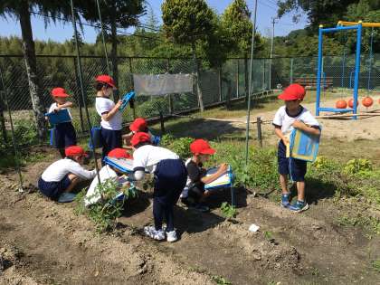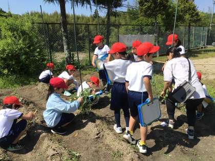2年生が、畑で育てている野菜の観察をしていました。「大きくなってる!」「この小さいのは、芽かな?」と、生長を喜んでいました。30センチものさしで測れないくらい伸びている茎もあり、友達と協力して測りました。