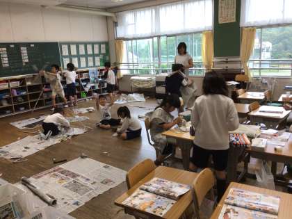 2年生が、図画工作科「しんぶんしとなかよし」で、新聞紙を丸めたり、破ったりし、全身を使って活動していました。触った感じを基に、自分のイメージを広げ、作り出す楽しさを味わっていました。