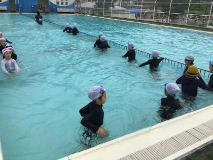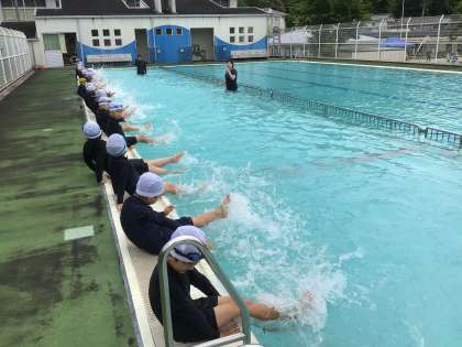 1・2年生が、プール開きをしました。プールサイドに座ってバタ足をしたり、洗濯機のようにぐるぐる歩いたりしました。「気持ちいい!」「面白い!」と、歓声が上がり楽しそうでした。