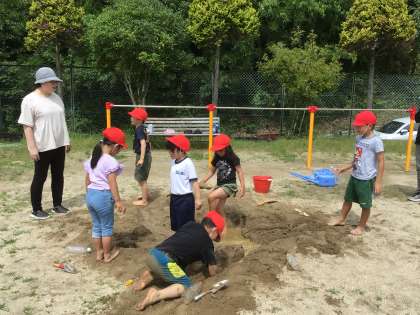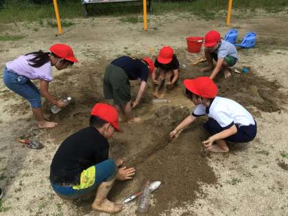 1年生が、生活科「なつと なかよし」をしました。土の感触を楽しみながら、友だちと声を掛け合い、楽しそうに活動していました。