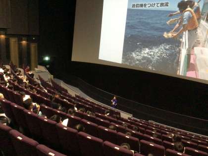シアターで、名古屋港水族館の方から、ウミガメや海洋プラスチック、太平洋ゴミベルト、マイクロプラスチックなどについてのお話を聞きました。人によるゴミで、ウミガメが産卵する砂浜や、海の中が汚れてしまっていることが分かりました。小さいマイクロプラスチックは、海の中の生き物が食べたり、遠くまで運ばれてしまったりします。ゴミを減らすにはどうしたらよいか考えました。
