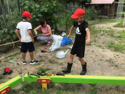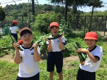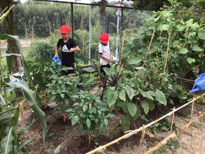 今週は、野菜をたくさん収穫することができました。地域講師の方から、育てるコツを教えてもらい、子どもたちが、水やりや肥料などの世話を一生懸命行ったからです。子どもたちは、大きく育った野菜を見せ、とても嬉しそうでした。次は、どの野菜が収穫できるか楽しみです。