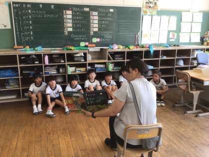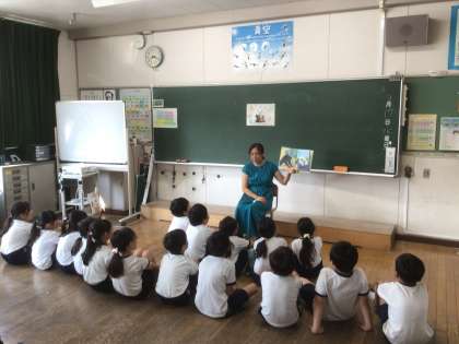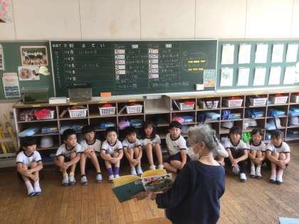 パンダの会は、教員による読み聞かせです。子どもたちは、集中して読み聞かせを聴いていました。