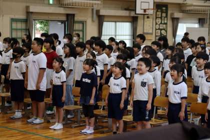 9月25日(木)に、水質汚濁調査連続18000日達成記念行事を行いました。愛唱歌「水のハーモニー」を合唱し、「水質汚濁調査の歩み」を6年生が発表しました。