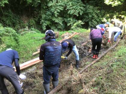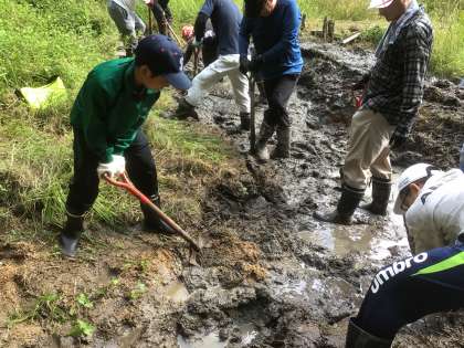 水が流れるように、泥を取り除いたり、丸太を使った囲いを作ったりしました。卒業した中学生も大活躍でした。
