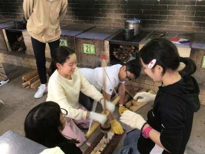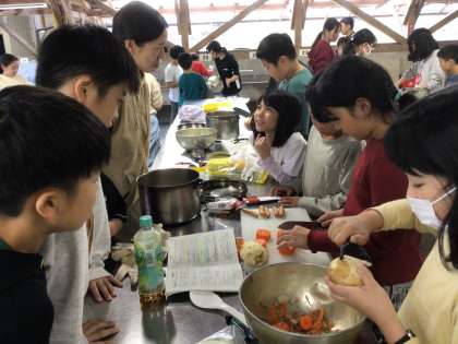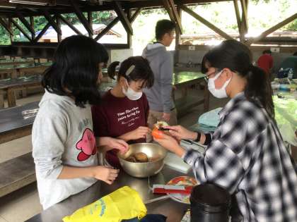 野外炊事と火起こしに挑戦しました。どのグループも、協力して、楽しそうに食材を切ったり、かまどの用意をしたりしていました。火おこしに成功したときは、歓声が上がりました。カレーライスが楽しみです。
