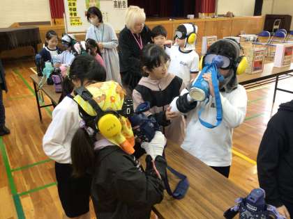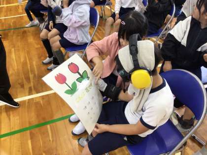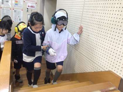 10月24日(金)に、3年生が、総合的な学習で「福祉実践教室」を行いました。子どもたちは、高齢者体験をするために、ゴーグル、耳当て、手袋、手足に重りをつけました。80歳代の体を体感し、「見えにくい色がある」「指先の指紋がつるつるで、コインがつかみにくいし、入れにくい」「物が拾いにくい」など、たくさん気づくことができました。自分ができることを考えて、「歩くときには、優しく声をかけて、そっと背中に手を添えたい」と発言する子がいました。