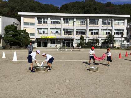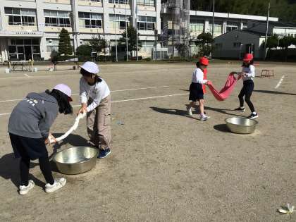 3・4年生が、歓声を上げながら、運動会の練習をしていました。種目は、競遊「一滴残らず絞り切れ!バスタオルリレー」です。2人組で水を吸ったバスタオルを運び、障害物を超えて、バスタオルを絞って水をためます。速いだけでは勝てないリレーで、とても楽しそうでした。