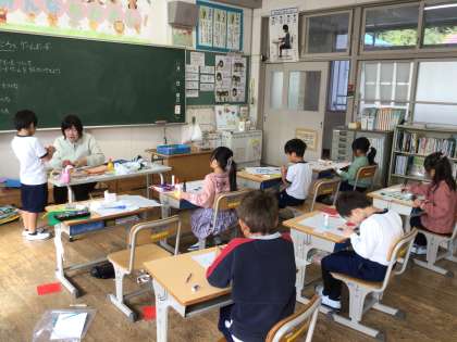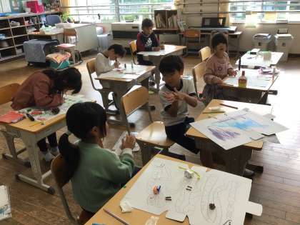 1年生が、図工で「わくわく おはなし すごろく」で、自分の表したい世界を想像し、マスで起きる出来事などを考え、ペンなどを使ってかいたりつくったりしていました。みんなで楽しく遊ぶのが楽しみです。