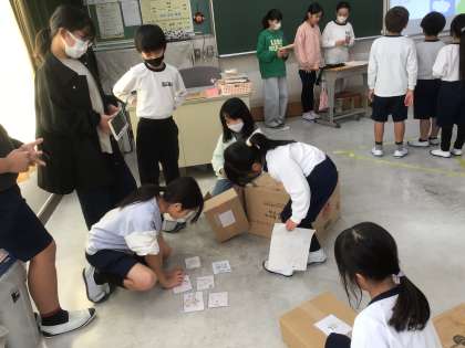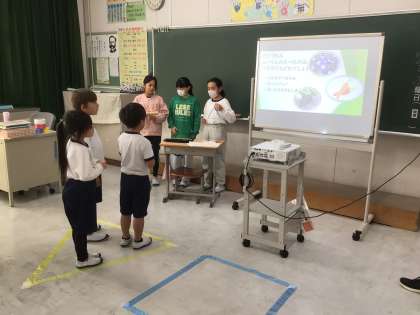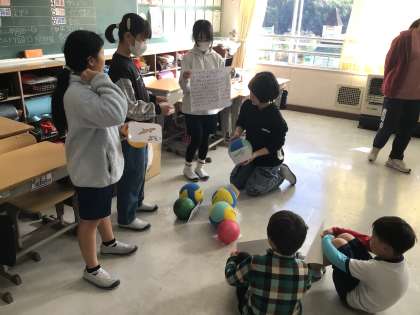 5年生が1年生に、丸根山のムササビについて、調べたことを発表しました。1年生は、ゲームやクイズに挑戦しながら、楽しく学ぶことができました。