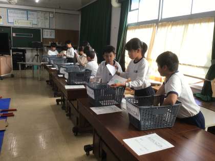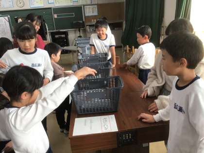 4年生が、2年生にエコ活動の紹介をしました。2年生は、釣ったごみの分別にチャレンジし、4年生は分別チェックをしました。みんなで楽しくごみの分別について学びました。