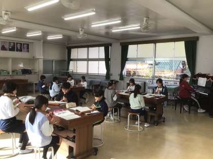 5年生が、音楽の授業で、楽しそうに歌ったりリコーダーの演奏をしたりしていました。子どもたちが、おすすめの曲は「カントリーロード」です。とても上手で、美しい音色が心に響きました。