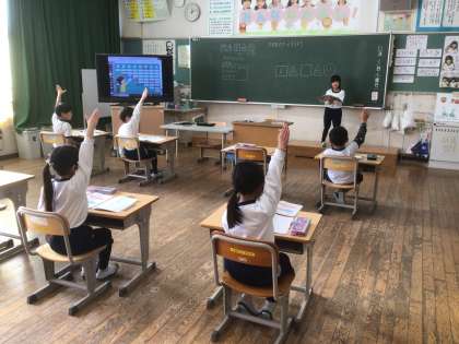 1年生が、算数科「かずあて ゲーム」の学習をしていました。友だちがつくった問題の□の中に入る数を当てるゲームです。なぜその数なのかを話し合いながら、たし算やひき算の理解を深めました。