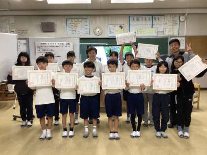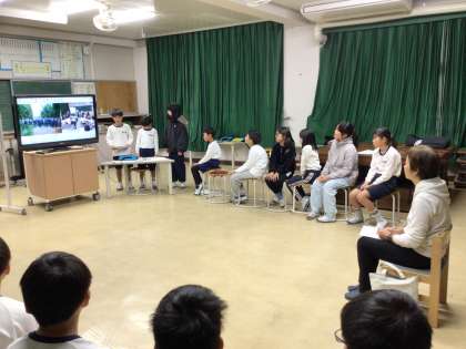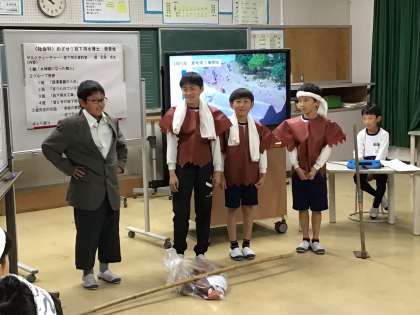 4年生が、枝下用水資料室代表の逵先生をお招きして、社会科「きょう土の伝統・文化と先人たち」の学習の成果を発表しました。西澤真蔵の功績を、劇やパワーポイントなどで伝えました。逵先生から、たくさん誉めていただき、枝下用水博士認定証をいただきました。