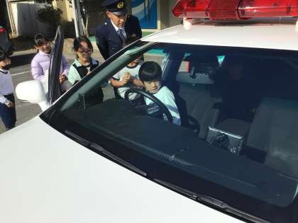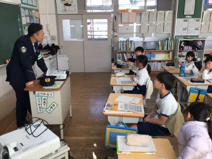 3年生が、社会科「事故や事件からくらしを守る」の学習で、出前授業を行いました。町の安全を守るために、警察はどのようなことを行っているのかを教えていただきました。子どもたちは、実際にパトカーを見せていただき、興味津々でした。