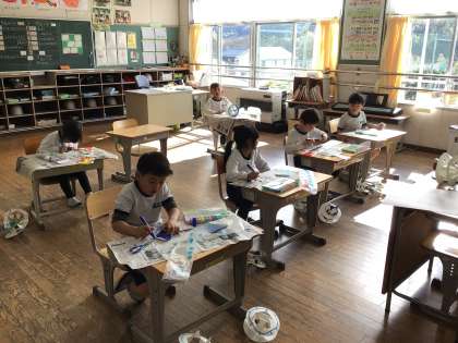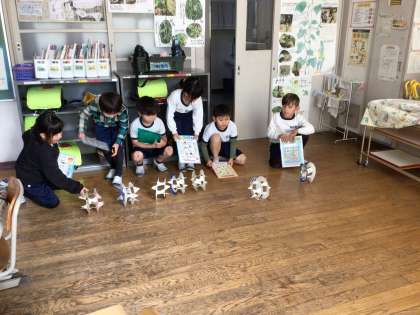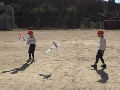 1年生が、図工の授業で、転がしたり飛ばしたりして遊ぶものをつくる活動に、取り組みました。出来上がった後、みんなで楽しく遊びました。
