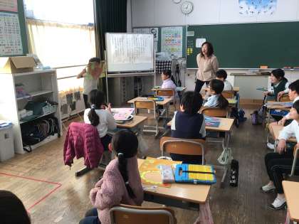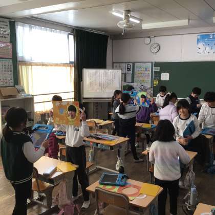 3年生が、図画工作科「顔を出したらなんだかワクワク」で、顔を出したくなるパネルを完成させ、鑑賞会を行っていました。子どもたちは、顔の表情にこだわってパネルから顔を出し、お互いの作品を楽しみました。