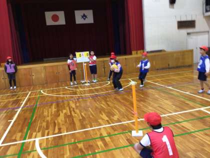 4年生が、体育の授業で、プレルボールをしていました。チームの仲間と声をかけながら、バウンドパスをつなげていました。相手チームのボールを上手にキャッチすると、「すごい!」「いいね!」と、声が上がりました。