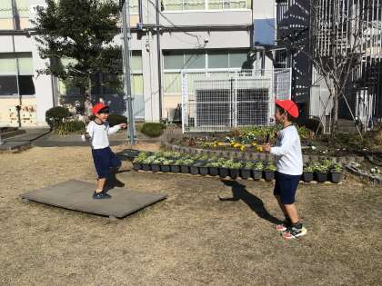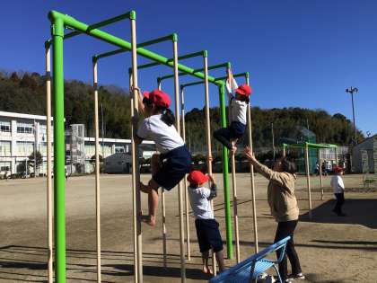 1・2年生が、運動場に出て、元気よく体育の授業を行っていました。朝はとても寒かったですが、ぽかぽかと心地よい陽気になっていました。子どもたちは、鉄棒や縄跳び、のぼり棒などにチャレンジして「見て!こんな技ができるようになったよ」と、とても楽しそうでした。