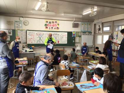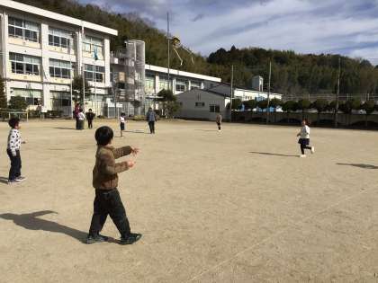 1・2年生が、ものづくり教室で、講師の方に教えていただき、凧を作りました。作った凧で、木曜日に凧あげをします。今日は、みんなで見本の凧をあげてみました。風があまり吹いていなかったですが、子どもたちは、歓声を上げながら、糸を引いたり伸ばしたりして凧あげをしました。