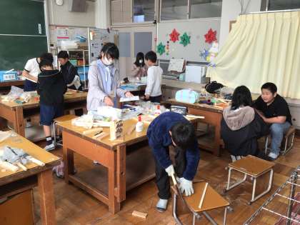 4年生の図工科「のこぎりギコギコ」は、進んで木を思いのままに切ったり組み合わせたりして表す活動をして、つくりだす喜びを味わう学習です。子どもたちは、夢中になって作品作りに取り組んでいました。