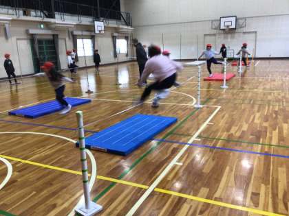 3・4年生が、体育の授業で「高跳び」に挑戦していました。みんなで、どの角度で踏み切ると跳びやすいかを確認していました。5歩での助走リズムも意識して、跳べるまで何度も練習していました。