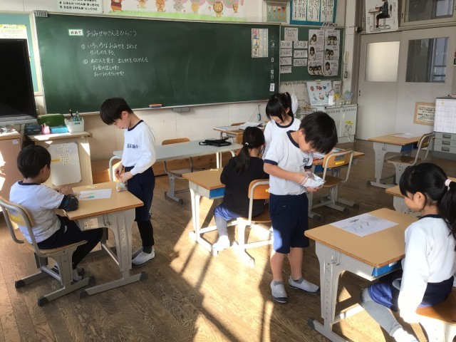 1年生が、算数科「かえますか?かえませんか?」で、お買い物をして楽しく学習していました。お店の商品を、持っているお金で買えるか買えないかを判断し、説明できるようなりました。