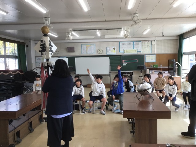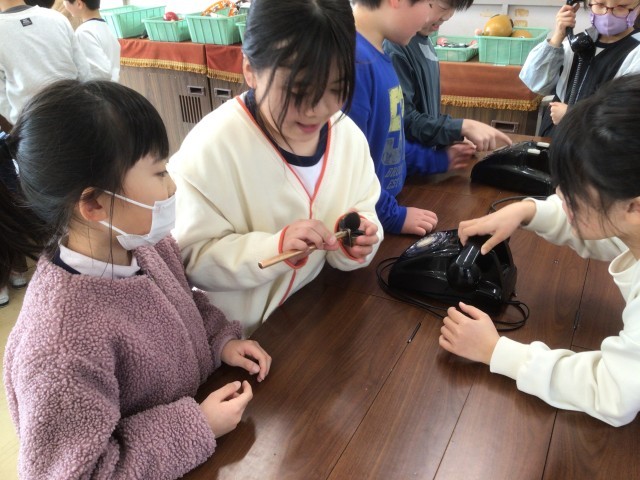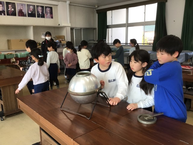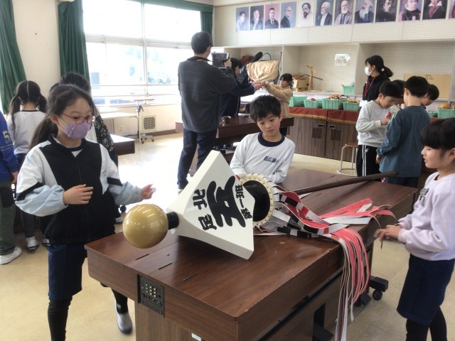 2月16日(月)に、3年生が社会科「市のうつりかわり」の学習で、豊田市民芸館の館長さんをお招きし、出前授業を行いました。子どもたちは、実際に昔の道具を手に取り、何に使ったか予想したり、昔の生活について考えたりしました。体験を通して、生活の変化を実感的にとらえることができました。