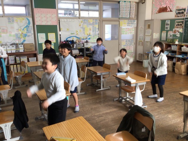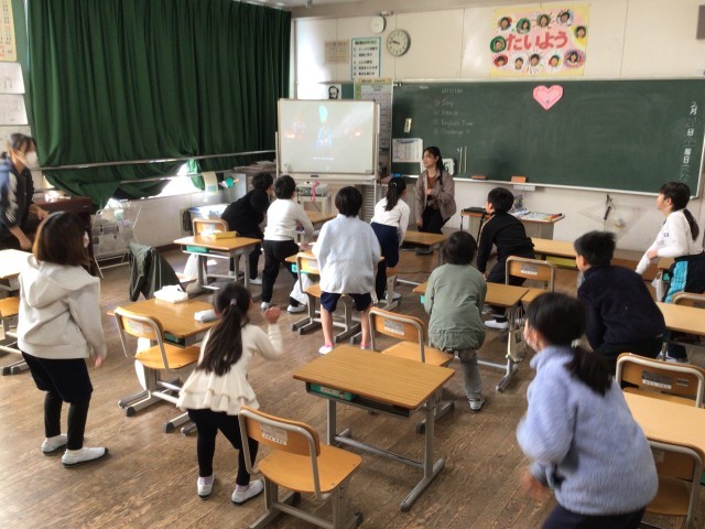 2年生が、英語のダンスをしたり、言葉を聞いたりして、英語に親しんでいました。とても楽しそうでした。