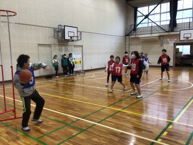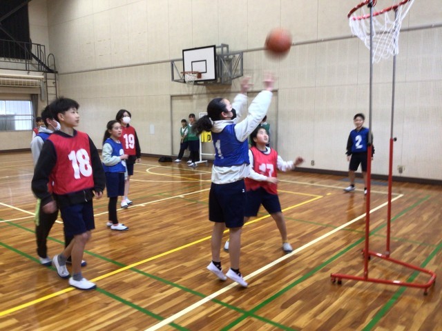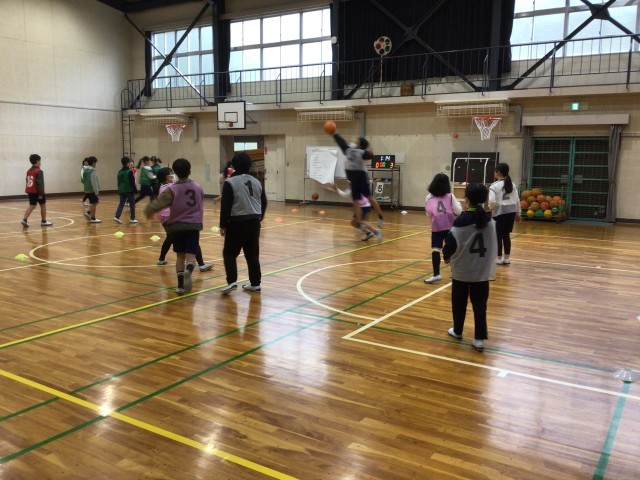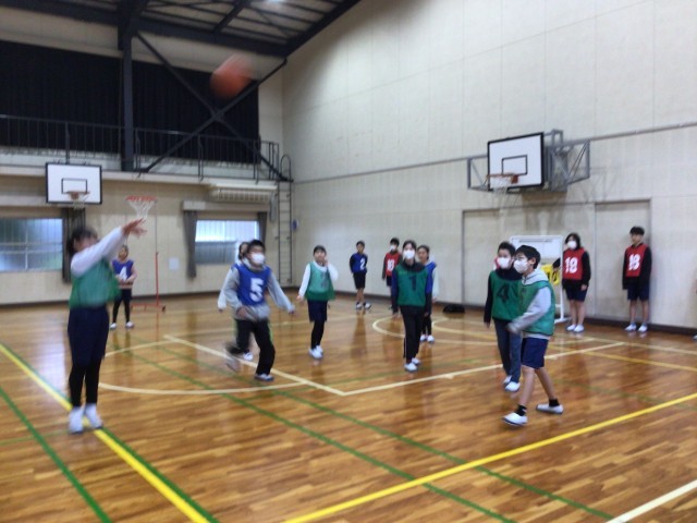 雨の日だったので、5・6年生が、体育館でセスケットボールゲームをしていました。とても楽しそうでした。