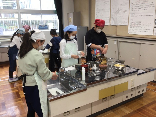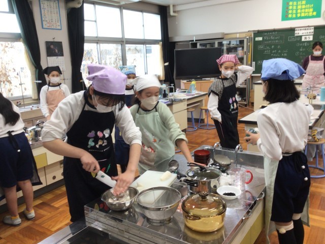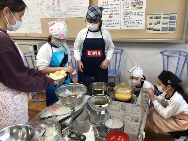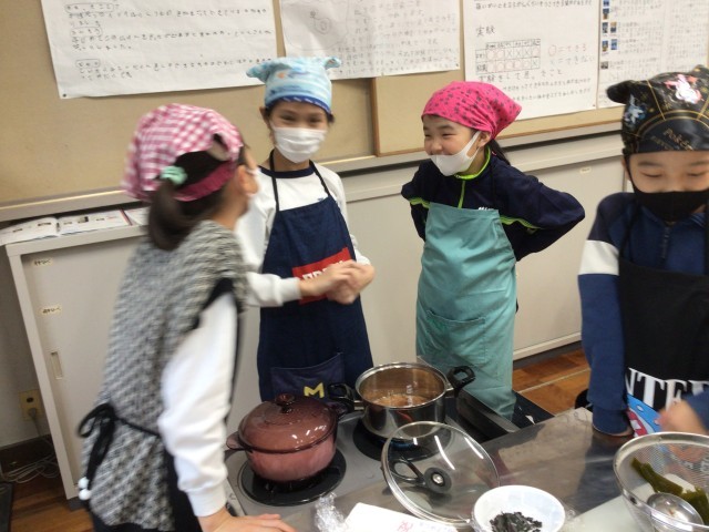 5年生が、家庭科の授業で、ご飯とお味噌汁の調理実習をしていました。ご飯を炊きながら様子を観察したり、みそ汁のつくり方を確認し合ったりして、楽しそうに活動していました。