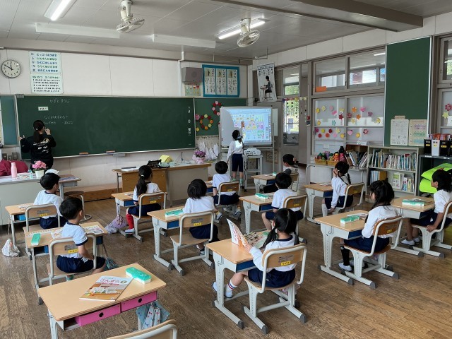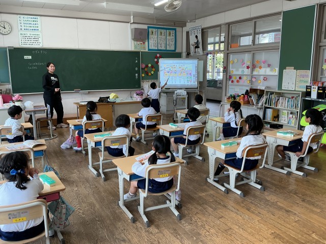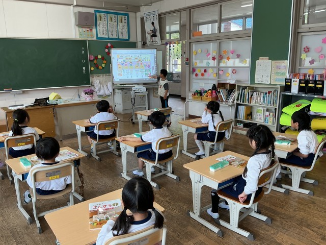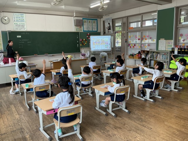 1年生が、算数科「かずとすうじ」の学習で、元気よく手を挙げていました。友だちの意見もしっかり聞いていました。