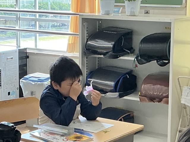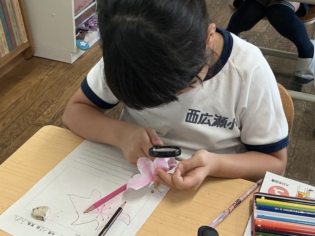 3年生の理科「いきものしらべ」の学習では、身の回りの生物を探す中で、それらの様子に着目し比較しながら、生物の特徴を調べる活動をしました。今日は、みんなでツツジの花の観察にチャレンジしました。虫メガネを上手に使って、細かいところまでじっくり観察することができました。