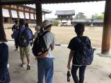 法隆寺の五重塔前で記念撮影をして、境内を見学しています。天気は小雨で、散策には...
