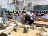 1年生の陶芸作品はカエルです。机に並べられるカエルを身を乗り出して見ていました...