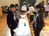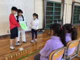 5年生が4年生に矢作川の水質汚濁調査に関しての活動を説明しました。透視度の測定...