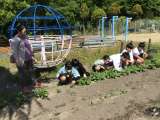 1年生の横で、6年生がジャガイモの観察をしていました。以前植えた種芋から出た芽...