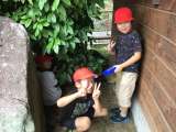 雨が上がりました。ウッドデッキで、わくわく班が集まってお弁当をいただいています...